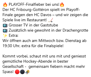 In unserer gemütlichen „Drache Grotta“ zeigen wir dir alle Spiele des HC Fribourg Gotteron „LIVE“ (ausser Dienstags und Mittwochs).